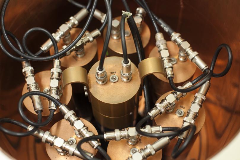 The anti-cosmic device used by the lab in the past is kept outside the shielded room. This device is what inspired the team at LMRE to design the simpler, more compact anti-cosmic systems now installed inside the shielded room.