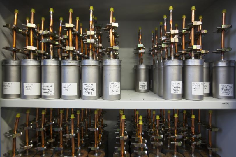 Following this period in storage, the containers are placed in the rare gas mass spectrometer to measure the two isotopes 3He and 4He. The results for 3He can then be used to calculate tritium activity levels based on its half-life.