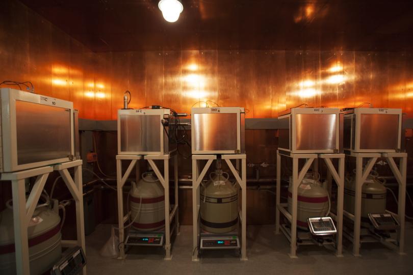 The equipment installed at LMRE is used to analyze water and dehydrated solid samples. A sample is placed in a metal container. Following vacuum degassing, the container is sealed and stored for a period of time that depends on the desired performance (usually 4 months). The sample is stored to allow the production of 3He as tritium decays.